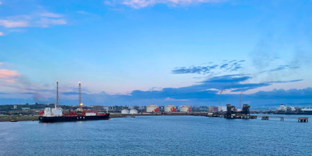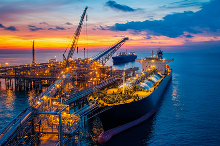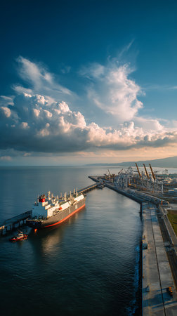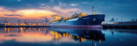 A striking image of a large cargo ship docked at an industrial port during a vibrant sunset, reflecting in the calm water, highlighting maritime activity and energy industry.
