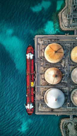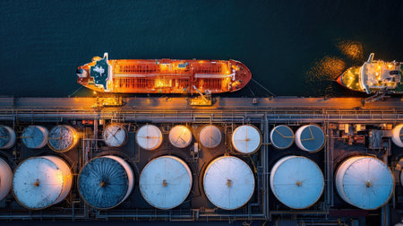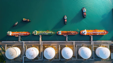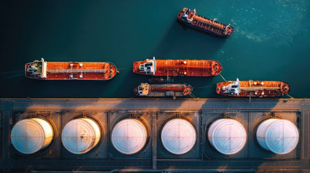 An overhead perspective reveals cargo ships docked at a commercial harbor, alongside storage tanks. The composition features various vessels and white tanks, set against the backdrop of blue water and a gray pier. This image is suited for commercial applications related to maritime commerce, energy, and transportation.