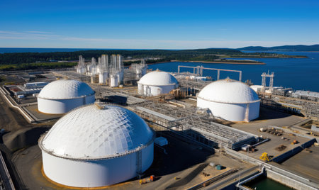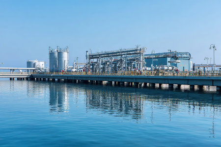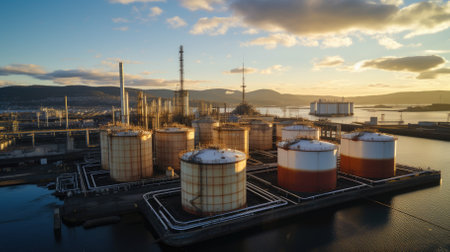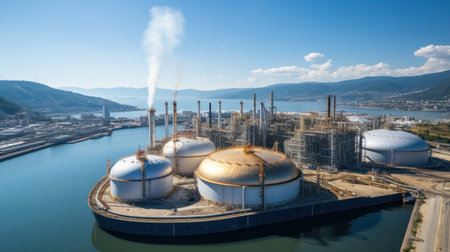 Industrial complex features large storage tanks and processing equipment along the waterfront, with reflections in calm water, highlighting advanced engineering and design