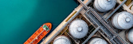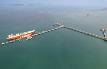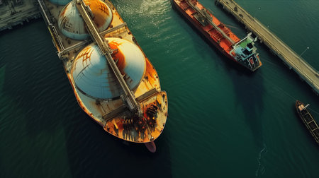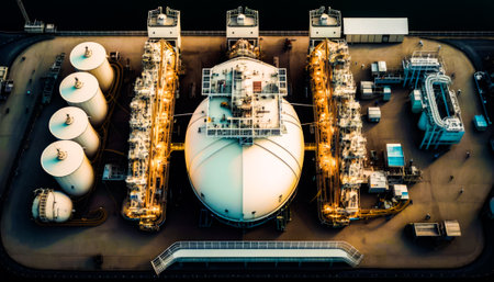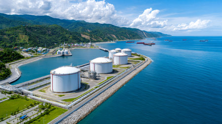 Aerial view of an lng terminal importing liquefied natural gas with tankers docked at the port, ensuring energy supply and security