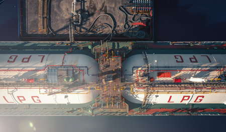 Top view Ship tanker gas LPG, Aerial view Liquefied Petroleum Gas LPG tanker, Tanker ship logistic and transportation business oil and gas industry, Loading oil and gas offshore platforms.