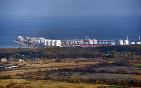 Ust-Luga oil terminal, Baltic pipeline system. Russia. View from the sea and reeds