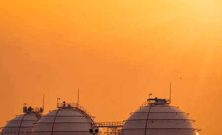 Industrial gas storage tank. LNG or liquefied natural gas storage tank. Spherical gas tank in petroleum refinery. Above-ground storage tank. Natural gas storage industry and global market consumption
