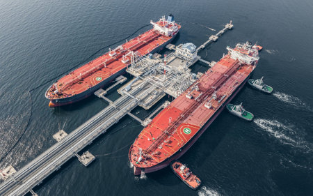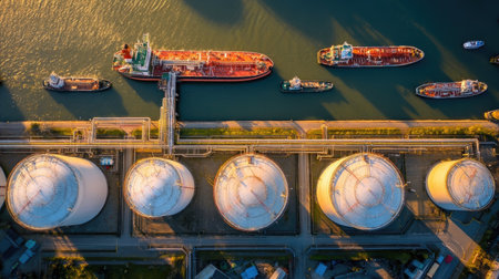 An aerial perspective showcases several tankers docked near large, white storage tanks, suggesting a coastal industrial site. The image displays a symmetrical composition with the tanks in the foreground. Sunlight bathes the scene, highlighting the colors of the ships and water. Suitable for illustrating energy, industry, or environmental topics.
