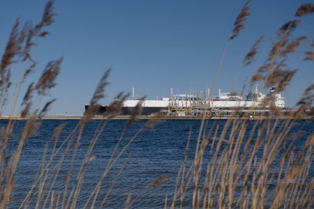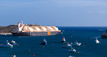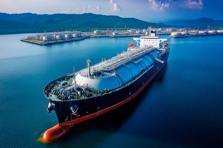 A massive liquefied natural gas tanker navigates into the port while several storage tanks stand in the foreground. The clear sky and water reflect a peaceful typical atmosphere of midday