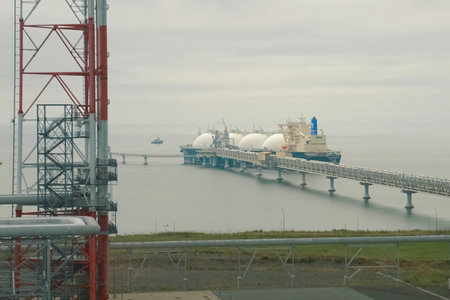 LNG tanker during loading at an liquefied natural gas offshore terminal