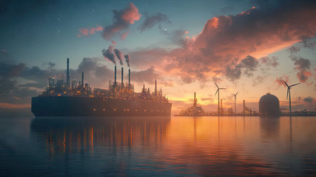 Beautiful industrial landscape featuring an oil refinery and wind turbines at sunset. The calm water reflects colorful clouds, highlighting a fusion of energy sources.