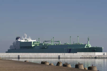 GAS CARRIER - Tanker at the wharf in the harbor at dawn