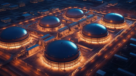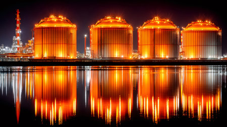 Gas storage tanks glowing at night, reflecting in the water, creating an industrial landscape