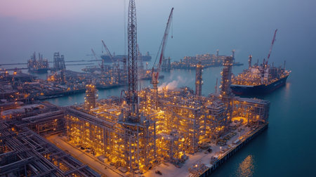 Aerial view of an illuminated oil refinery at dusk, showcasing cranes and ships in the port, reflecting modern industrial operations in a vibrant coastal environment.