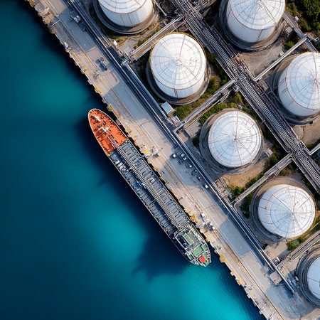 An overhead shot showcases cargo ships docked beside a row of industrial storage tanks. The image features a vibrant color palette, with the vessels exhibiting shades of orange and green against a backdrop of deep teal water. This composition, with its high-angle perspective and natural lighting, suggests uses in commercial or environmental contexts.