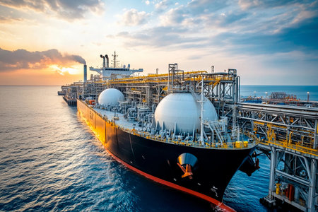 Large liquefied natural gas transport vessel is docked at the terminal in an industrial port against a colorful sunset backdrop.
