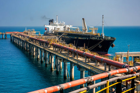 A large tanker is docked at an industrial port, surrounded by pipelines and machinery. The clear blue sky complements the vibrant water, creating a busy yet serene atmosphere.