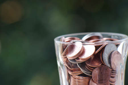Coins in a glass on a green bokeh background.
