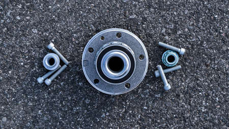 Sapre parts. Auto motor mechanic spare or automotive piece on dark road asphalt background. Set of new metal car part. Surface grunge rough of asphalt