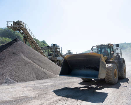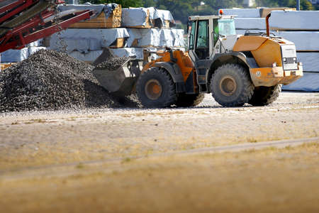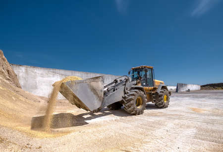 Industrial - machinery working. Close up of wheel loader loading gravel into dumper trucks