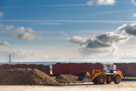 A sugar beet harvest in progress - Tractor loads sugar beet into the train cars to be sent to the sugar factory. Sugar industry is one of the priority directions of social and economic development of the Republic of Belarus
