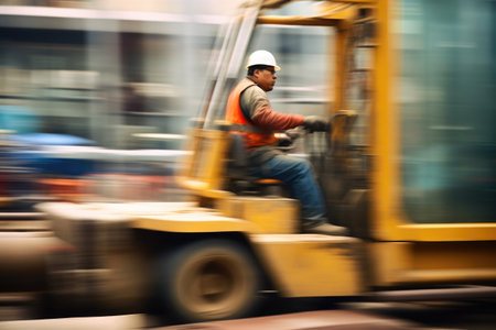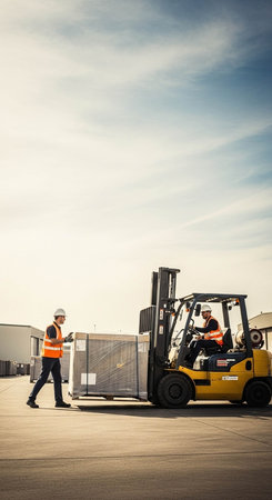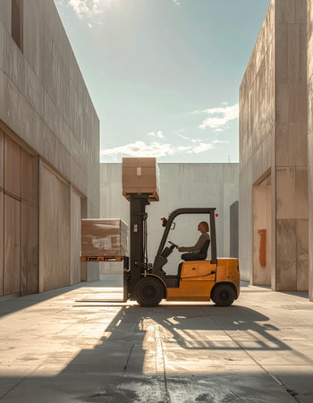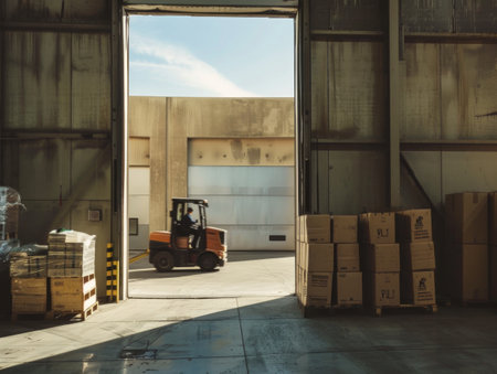 A skilled operator maneuvers a forklift through a sunlit loading bay, efficiently lifting a pallet of cargo.