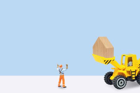 Real Estate and Architecture Construction Industry Concept : Wooden house on yellow truck building under construction with miniature people as labor working
