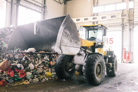 Hangar automated plant for sorting household waste. An excavator with a raised bucket collects and transports trash for recycling. Sorting