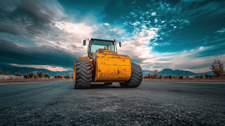 A heavy bulldozer stands on a construction site, showcasing its power against a stunning backdrop of clouds and mountainous terrain during sunset.