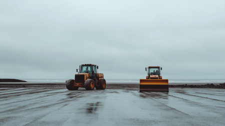 This image features two heavy machinery vehicles, a bulldozer and a grader, stationed on a coastal construction site under a cloudy sky. The wet surface reflects their presence in a rugged landscape.