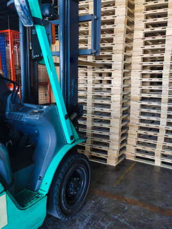 Worker driving forklift to loading and unloading wooden pallets from truck to warehouse cargo storage, shipment in logistics and transportation industrial, wood pallets stack