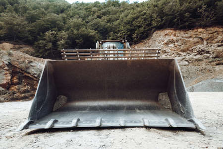 Close up details of wheel loader with empty scoop and bucket working on construction site