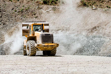 Wheel loader machine loading rocks in the open-mine, iron ore mining.