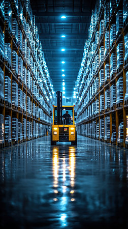 A bright yellow forklift operates in a vast, modern warehouse, navigating between tall racks of stored goods. The floor is shiny, reflecting the overhead lights.