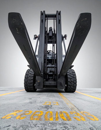 A powerful forklift stands ready for action in an industrial setting. Its forks are raised and spread wide, symbolizing readiness, strength, and the capacity to handle heavy loads.