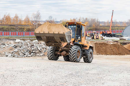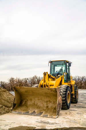 Heavy wheel loader with a bucket at a construction site. Equipment for earthworks, transportation and loading of bulk materials - earth, sand, crushed stone