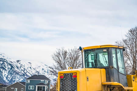 Bulldozer at a construction site against homes trees mountain and cloudy sky. The vehicle has yellow paint, empty cab, and rear lights.