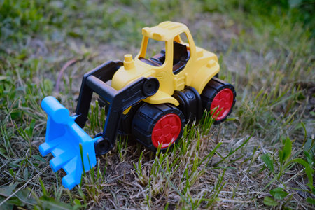 A vibrant yellow toy bulldozer is positioned on a patch of green grass showing its working scoop as it appears to be digging The sunny day adds to the playful atmosphere.