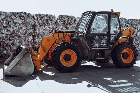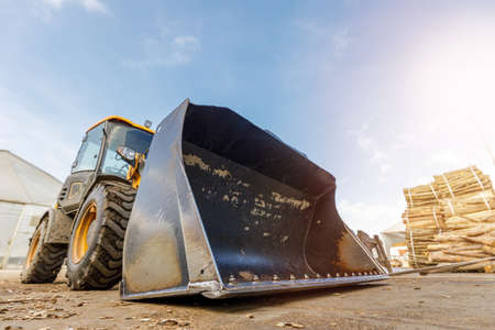 Yellow tractor with bucket standing in the yard of warehouse
