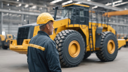 A construction worker wearing a hard hat stands in an expansive industrial warehouse, observing heavy machinery designed for various operations and safety protocols.
