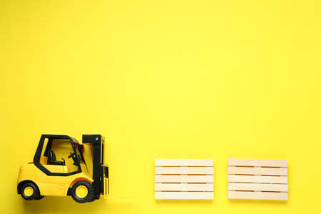Toy forklift and wooden pallets on yellow background, flat lay. Space for text