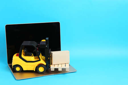 Laptop, toy forklift with wooden pallet and box on light blue background, space for text