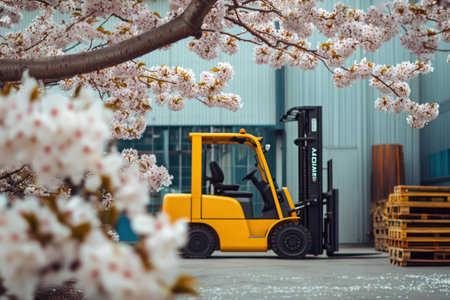 A bright yellow forklift stands in a warehouse yard with pink cherry blossoms in the foreground, blending industry with seasonal beauty.