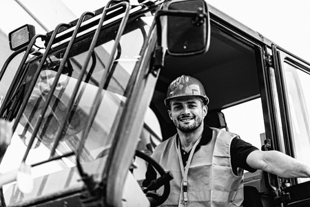 Manual worker driving cargo truck in plant