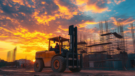 A heavy forklift operates on a construction site, silhouetted against a breathtaking sunset. The sky features vibrant oranges and blues, highlighting the ongoing industrial work.