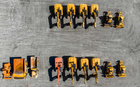 Large parking lot with big yellow mining truck, bulldozers for coal industry, ore and gold. Concept sale of industrial equipment. Aerial top view