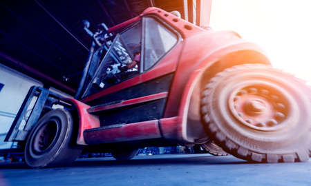 The big industrial forklift drives into the warehouse.