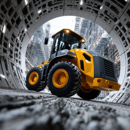 A yellow and black construction vehicle is driving through a tunnel. The tunnel is very narrow and the vehicle is the only one in it