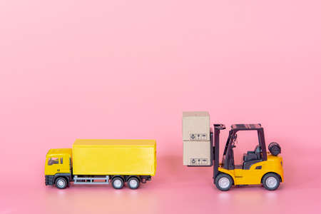 Logistics, and delivery service - Cargo truck, Forklift and paper cartons or parcel with a shopping cart logo on Pink background. Shopping service on The online web and offers home delivery.