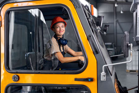 Beautiful woman forklift worker operator driving vehicle at warehouse, factory. female driving loader confidently, feminism and male work concept. lady in safety hardhat and uniform