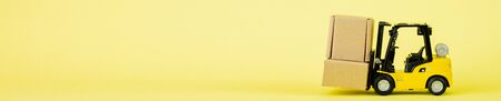 Miniature toy forklift flying in antigravity on yellow background with shadow. Levitation object in the air. Logistics, transportation concept. creative minimal layout