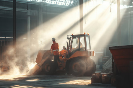 A worker maneuvers a loader in an industrial warehouse filled with dust and sunlight streaming through windows.