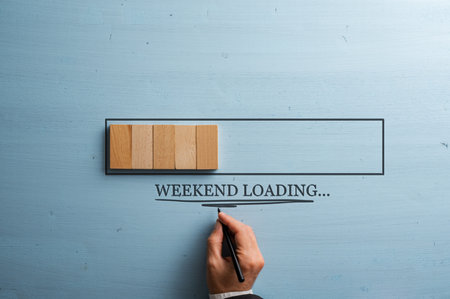 Male hand writing a Weekend loading sign under a loading bar made of wooden dominos. Over pastel blue wooden background.