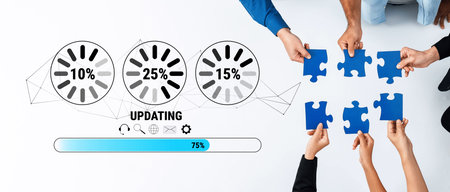 A group of individuals join hands to put together blue puzzle pieces, symbolizing teamwork and collaboration alongside a visual progress bar for effective project updates.